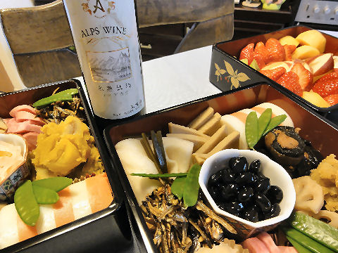 お正月家族が揃う年末・年始、ことしのおせちは少なめ?飲み物は塩尻アルプスワインのアイスワインに。甘めの食前酒という感じのワインだった。 |