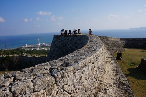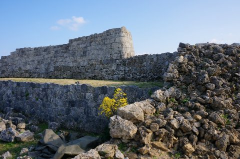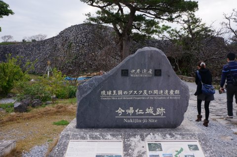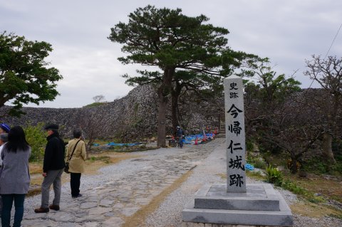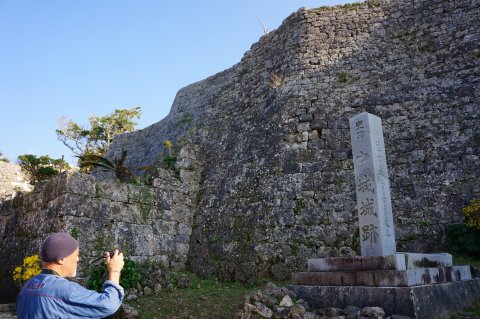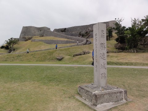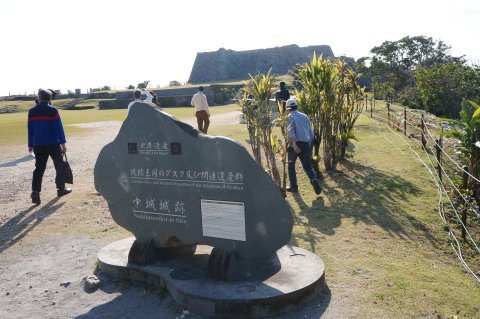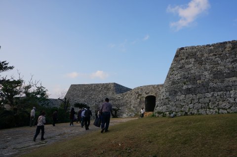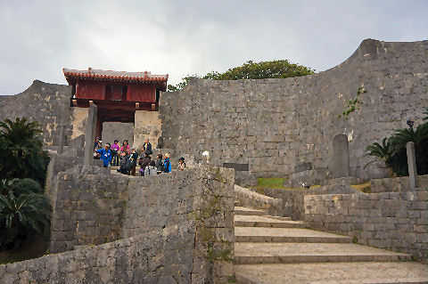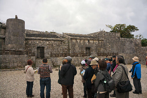 沖縄城廻ツアー:@中城城跡ANA469便で那覇へ、777-300が満席で500人なので乗降には時間がかかる。空港からバスで中城城址へ、初めて見る沖縄の城、石垣が琉球石灰岩で独特な形、入口には石のアーチとヨーロッパの城のような印象。 |