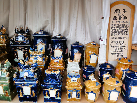 沖縄城廻ツアー:F玉陵(たまうどぅん)首里城近くにある玉陵へ、歴代の王族が葬られている墓地で中国風、三つの建物には遺骨が納められている。中には町で見かけた骨壺が並んでいるよう。 |
