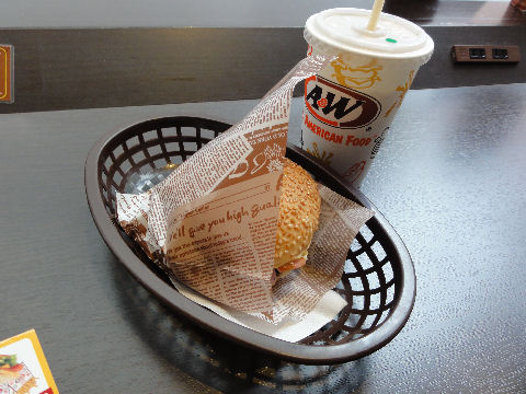 A&Wでルートビアを試す自由昼食だったので沖縄独特のA&Wへ入って食べてみた、ハンバーガーとルートビアで昼食。確かにルートビアはバスガイドの言うとおりサロンパスの味がしたがこれは薬草の味との事。 |