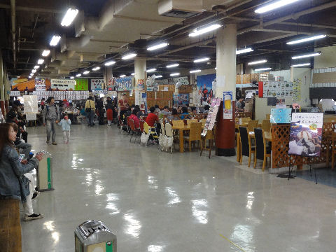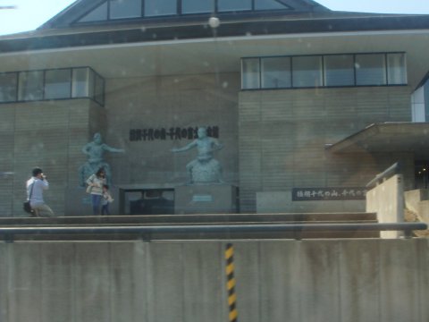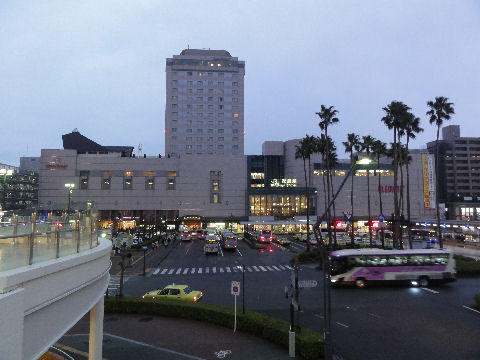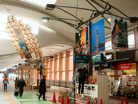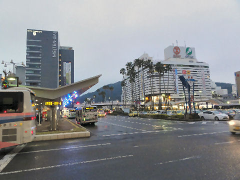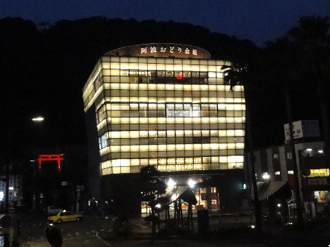 でも商店街は寂れて駅前の道を真っ直ぐ進むと「阿波おどり会館」へ突き当たる、夜8時から公演があったが雨模様で歩くのが大変で断念。その5階から眉山へのロープウェイが架かっている。 |