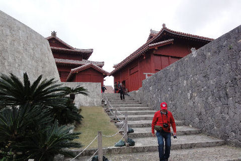 沖縄城廻ツアー:G首里城玉陵のあと歩いて首里城へ、有名な守礼門で民族衣装の女性を入れて記念撮影。その後ガイドの案内付で各施設を巡る。実際の世界遺産は小さな石の門と正殿の下に保存されている遺跡だけであとは再建された参考資料だという。 |