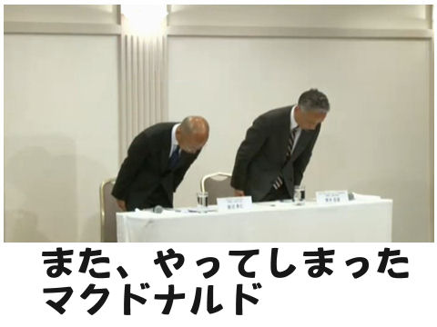 マックの異物対応、どこかで見たような風景!社長は雲隠れ?で会見には来ない、異物混入の公表基準は自分に都合よく、身内でないのでユーザ責任と取れる発言、と突っ込み所満点の「謝罪」会見。ますます客離れを加速するだけのトンデモ会見なのだが当事者はまったく理解できていないのはトヨタの初期とそっくり。 |