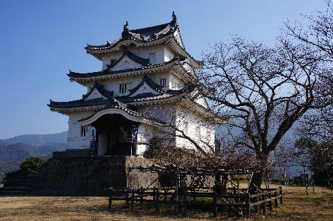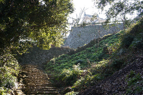 四国城巡り@:宇和島城朝9時に松山へ着いて特急「宇和海」で初訪問の宇和島へ。駅から見える小高い丘の上にある城、坂道を登って天守まで登る。仙台の伊達家から派遣された城主が江戸の最後まで続いたよう実戦は無かったとのこと。 |