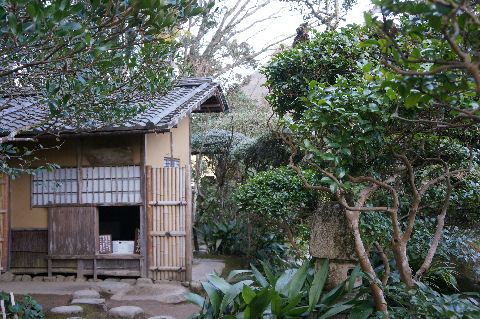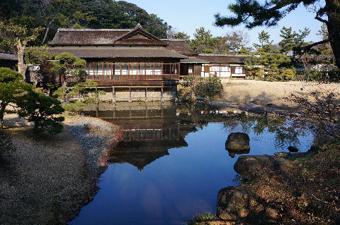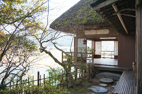 明治の豪商の庭園茅葺きの大きな屋根と高い天井が特徴、茶室?は川へせり出すように作られている。維持管理が大変なので大洲市に寄付され、その後屋根の葺き替えを行ったよう。 |