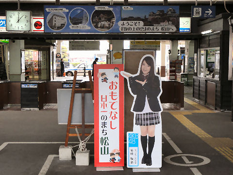 松山は活気のある街県庁所在地でもあり道後温泉など観光地もある元気な街で寂れている印象はない、県庁にはノーベル物理学賞受賞の中村氏を祝う垂れ幕も。AKB48メンバーを利用した観光PRも。 |