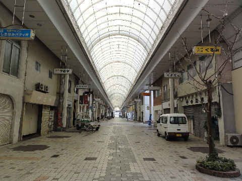 今治の街並み駅前も閑散、アーケード商店街はここもシャッター通りになってしまっている。国産の良質なタオルが見直されてきているが街の活気はまだ遠い? |