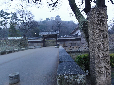 四国城巡りE-1:丸亀城明日は雨との予報で予定を前倒しして丸亀へ、ホテルへチェックインして暗くなり始めたお城を見にいった、天守閣はもう入れないので城の周りを一周。石垣が良く残されている。 |