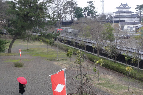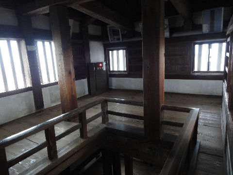 小雨の中、天守閣へ天守は現存12天守の一つ、急な階段を昇って最上階へ。外部に回廊もないので窓の隙間から外を眺めるのみ。 |