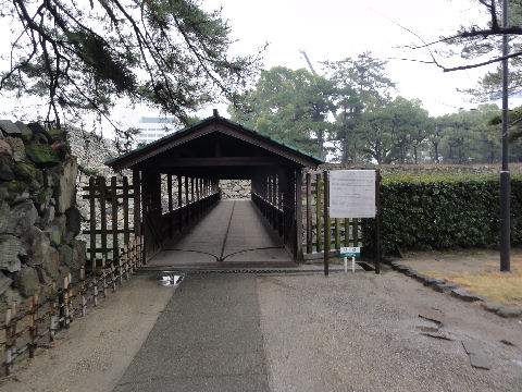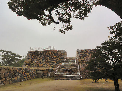四国城巡りF:高松城丸亀を早めに出て高松へ移動、駅前にある玉藻公園が高松城の跡。雨の中、天守台や庭園、2つ残る櫓などを見学。石垣の修復工事が進められているが |