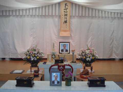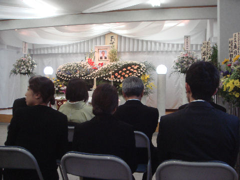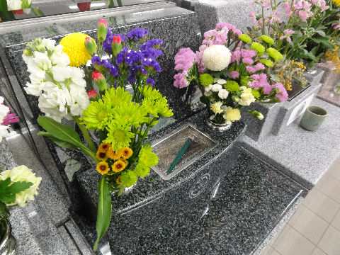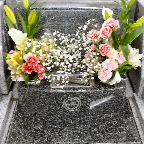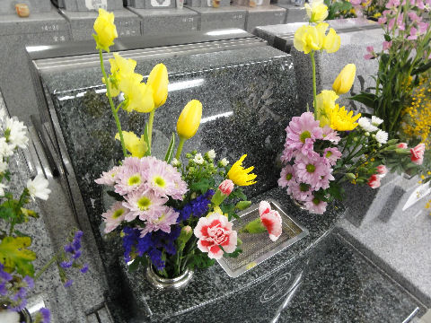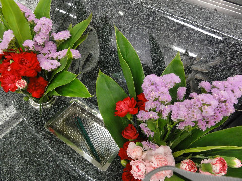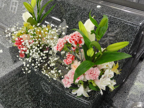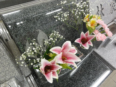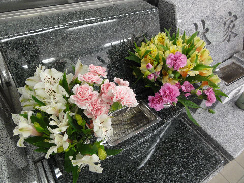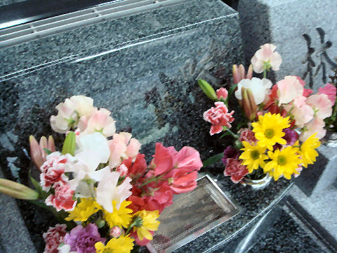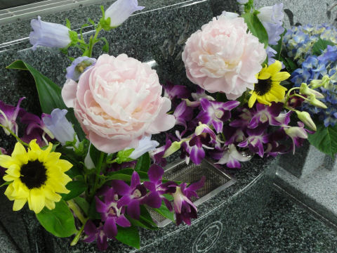 墓参りに旬の花を、ということで芍薬とミニひまわりを入れて選択した。仏花仏花している菊の花はもう止めた。 |