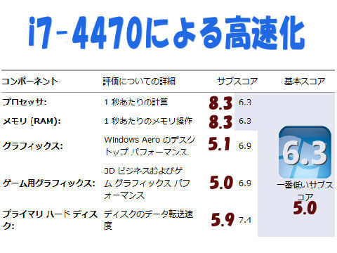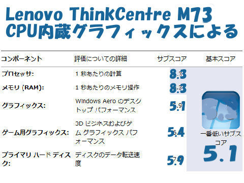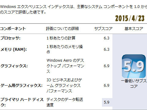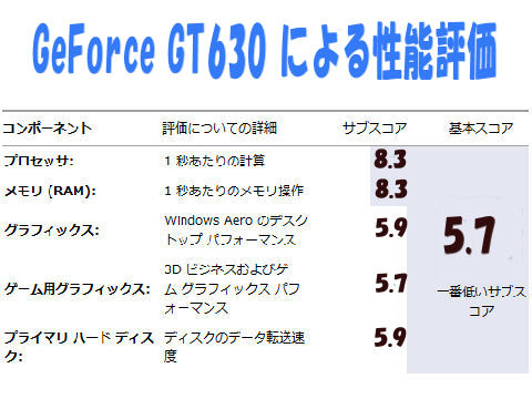 GeGorce GT630を早速試すビデオカードの追加で性能が20%弱の向上(5.1>5.9)となり快適に。更にDVI-D出力端子もあるのでデルのワイドモニタへそのまま接続可能となった。(オリジナルのHD4600ではDVI出力はなくVGAとDPのみ) |