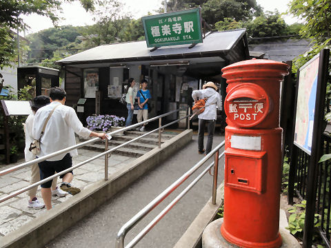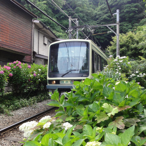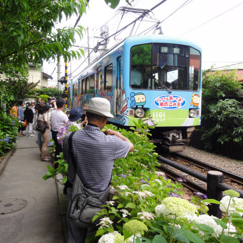 成就院は紫陽花無し成就院は広報されていた通り今年から工事のため紫陽花の花は無し、団子屋のポストの隣に咲いていた紫陽花も消えていた。御霊神社の前の踏切あたりは紫陽花と江ノ電を撮影する人で賑わっていた。 |