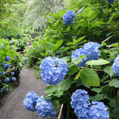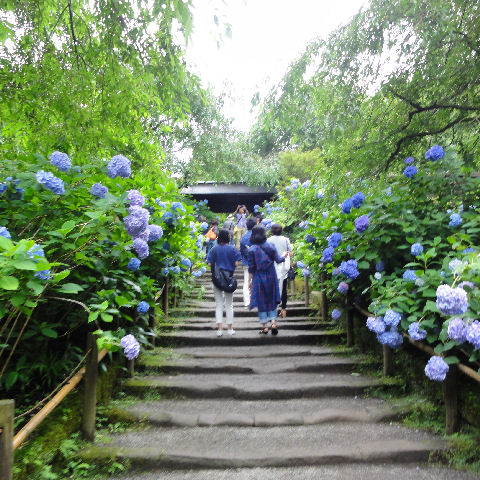 成就院と御霊神社へ雨続きなので運動不足の解消を兼ねて鎌倉へ、江の島まで歩き江ノ電で極楽寺駅との間を往復、都合2時間50分ほどの長めの散歩となった。極楽寺の前も紫陽花できれい、平日にも拘わらず結構人が多いのは鎌倉ならでは。 |