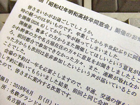 「ご好評につき来年も開催」と案内が来たが、往復交通費なども考えると代り映えのしない隔年同窓会に参加もどうかと。 恩師を誰も呼ばないままではどうかな、正式な案内が来てからじっくり思案しよう。 |