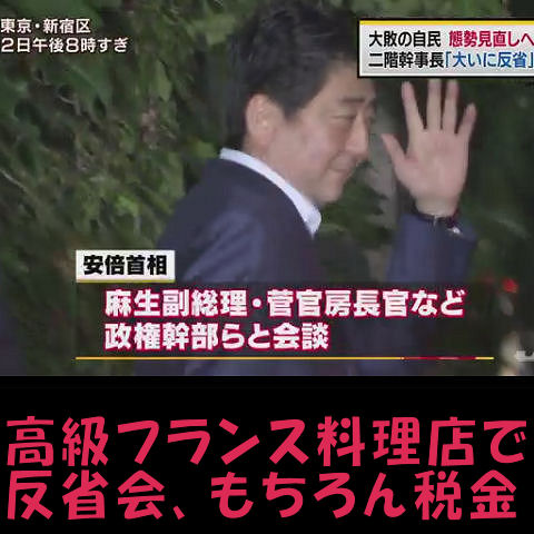 「優雅な反省会だな」が一般国民の素直な感想かと(どうせ税金で飲食しているのだろうが)、今週末からはまた豪華海外旅行に出掛ける「アホノミクス安倍」。 何故か疑惑時に逃げ回った無役の「甘利」が同席していたとか、その真意は? |