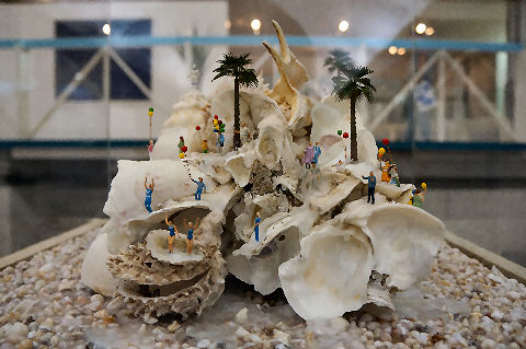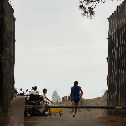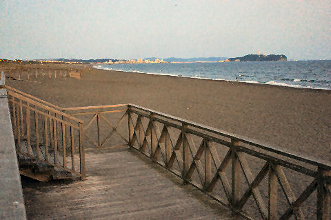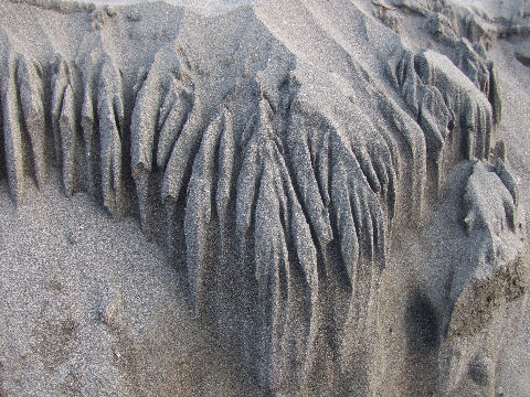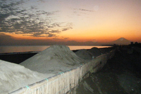 夕方、海岸の散策路を歩く、辻堂海岸の海水浴場(どこか良く解らないが)の海の家が着々準備中でもうじき営業開始(15日から)。 道脇に積もった砂が崩れて不思議な模様を作っている。 |