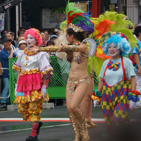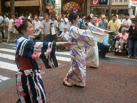 選ばれた3人の織姫が先頭となり踊りのパレードが中央通り(旧・東海道)を行進、織姫狙いのカメラマンで大混雑。織姫の車でのパレ―ドは明日。 |