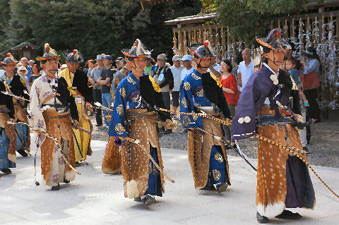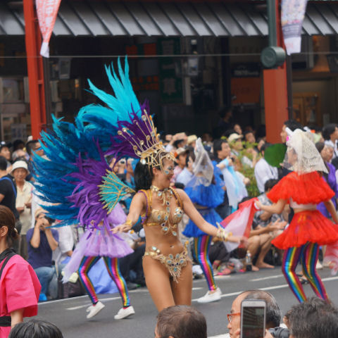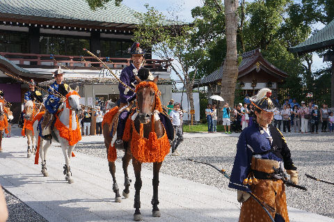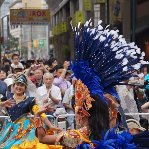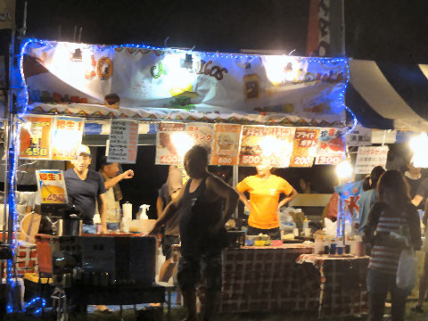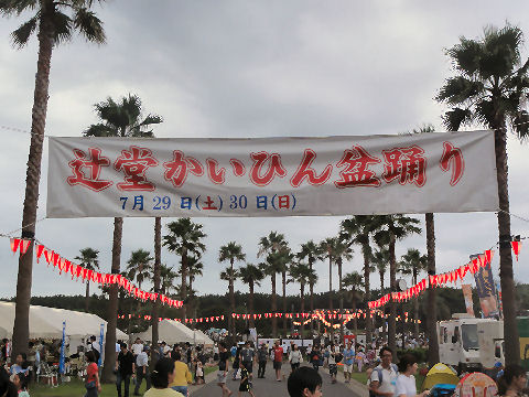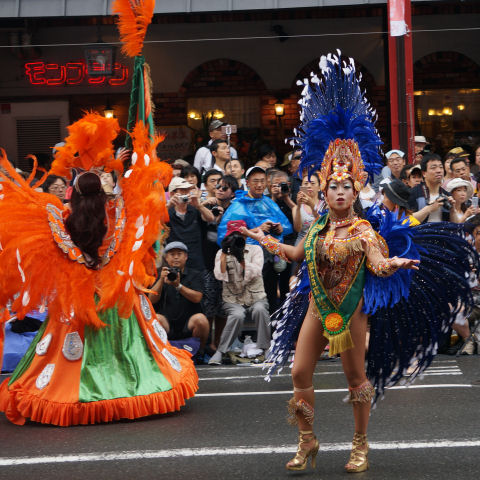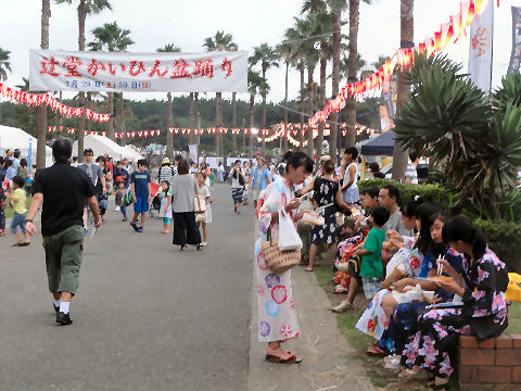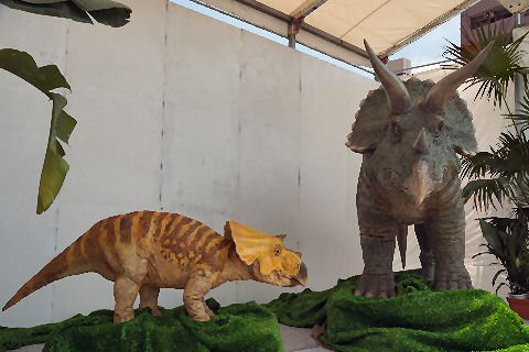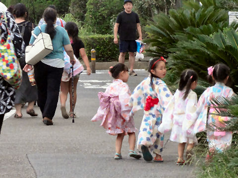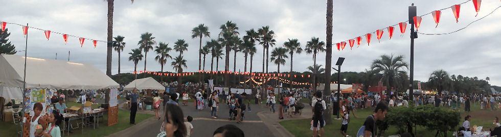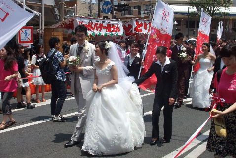 「七夕結婚式」のパレードも以前にも見かけたが「七夕挙式」のカップル4組がパレード、暑い中の礼服・ドレスで大変そう。 メイン会場の広場では恐竜のロボットの展示や太鼓(何故か伊豆、姉妹都市だから?)の演奏もあり。 |