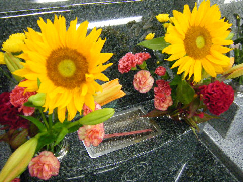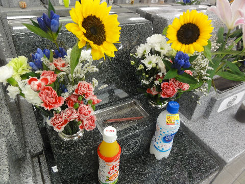 午前中に墓参りに、新盆なので花を売るテントが出ていた。飲み物を買っていって備えてあげた。 |