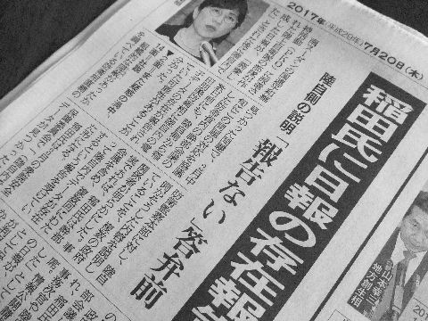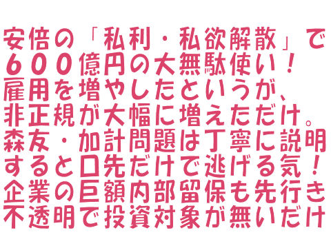 「口先反省」で支持率は更に低下、当然だろう「真摯に反省する」というだけで何も具体策なしのいつもの口先ダケ反省の安倍。主犯は安倍、THIS4人組(豊田、萩生田、稲田、下村)と連携して「支持率低下」、 演説のヤジに「あんな人たち」と非難、自身は国会でヤジ放題の身勝手さは自明。内閣改造を8月始めにするようだが、また「オトモダチ」「お気に入り」の取巻きばかり? |