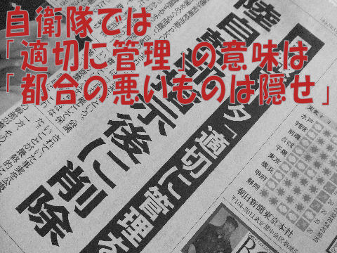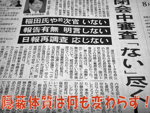 「隠蔽疑惑」真っ只中だが「管理の適正化」とは「拙いものは隠せ、捨てろ」という大臣指示だったとは。今や大臣は知っていて「知らない」と国会答弁した疑惑が拡大。 まったく猛暑の真っ最中なのに暑苦しい疑惑続出や自己中オバはんの話題ばかり報道ででげんなり。 |