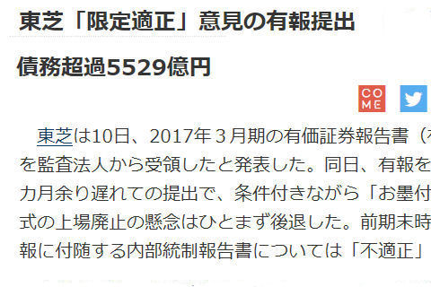 こちらも「最後の株主総会」の可能性?国に騙され(騙される方も大いに問題だが)インチキWHの非常識な高値掴みで大失敗がそもそもの原因。強権トップの損益ゴマカシにつづく打撃で再起不能になり「虎の子」メモリ事業を 売ることになったが米韓メーカらの異論続出で大難航。このままでは「上場廃止」となる可能性も十分にあり。 |