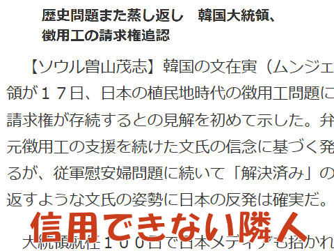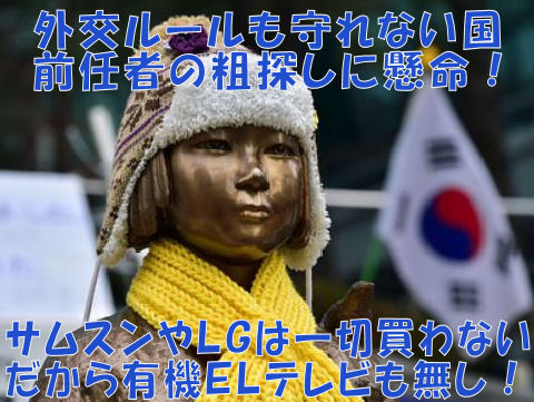 このどうしようもない韓国!他国との外交取り決めを前政権がやった事だと守らず破棄しようとする非常識な国、それなのに平昌五輪には安倍に来てほしいだと。 片手で殴っておいて反対の手で握手を求めるような非礼さ。 歴代の大統領は暗殺されるか、次の政権で告発され有罪になるという国、今の文大統領もやめた途端に訴追され有罪になる? もうサムスンやLGの製品は一切買わないことにしよう、国交断絶しても日本は何も困らないし。 |