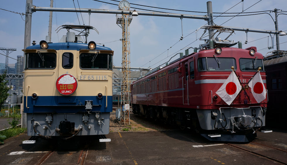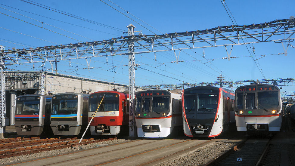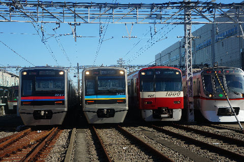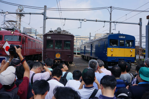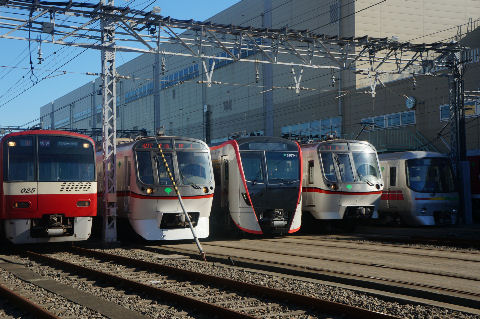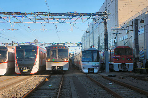 都営フェスタ2017@馬込車両基地都営浅草線を走る主な車両が並んで撮影可能、京成線、京急線も参加。一番右は大江戸線のちょっと小さいリニアモータ式の車両。 大門〜新橋駅間に汐留駅とつながる連絡線があり牽引用の機関車で引っ張ってくるよう。 |
