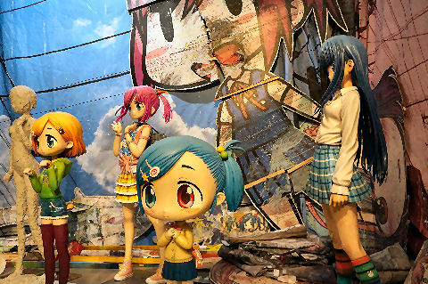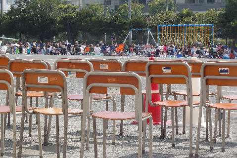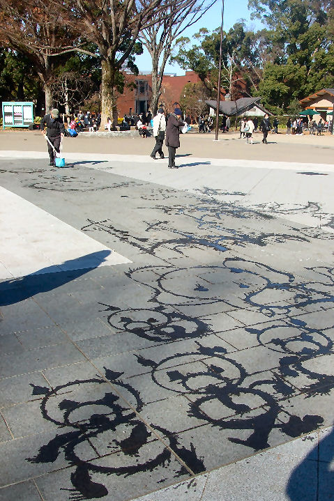 水で絵を描くオジサン噴水広場の周りでは東京舞祭りというイベントが開催前、近くの広場では水で絵を描くオジサンの作品が。 |
