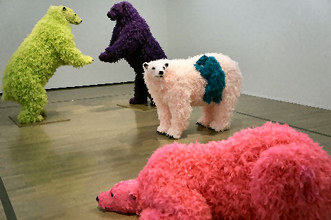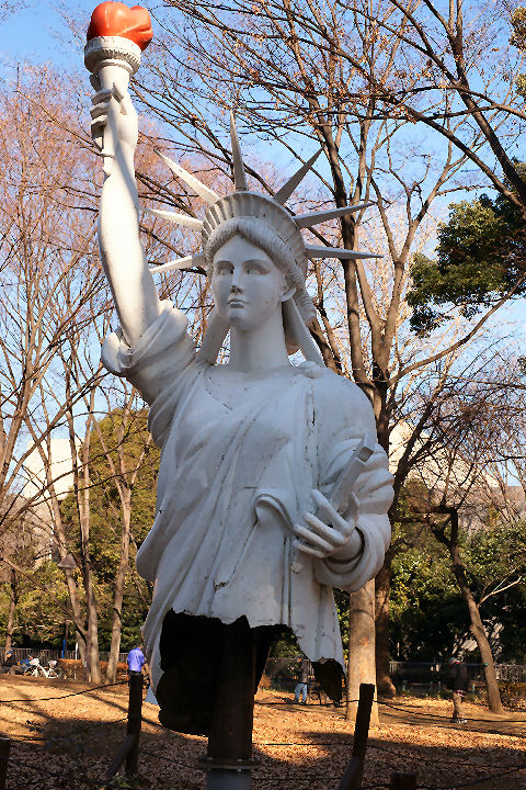 上野動物園はパンダ一色だが白鳥は午後4時ころの餌やりの時間が見頃なので時間調節、まずは前回見落とした?自由の女神像、これは東京芸大の卒業制作の作品。 近くにウサギが団子になった彫刻もある。上野動物園はパンダもあり賑わい、後ろに見えるのは旧寛永寺の五重塔、元は上野東照宮の五重塔だが神仏分離で孤立し東京都へ寄付、今は動物園の敷地内。 |