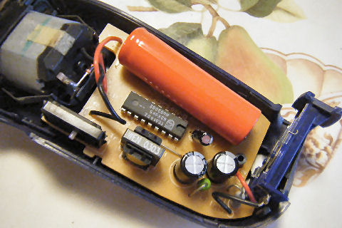 古いシェーバーを修理?父の遺品?として持って帰ったシェーバー、電池があがって動作せず。中を開けるとニッカド電池だったので前回交換した古い電池を探して半田付け。 タブがほとんど無くなっていたのでニッケル部分へ強引に半田付け。 |
