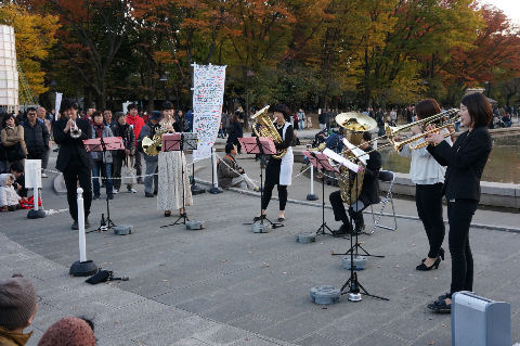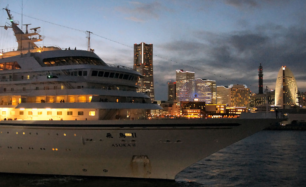 飛鳥Uが名古屋へ出航コンサートが4時過ぎに終了、外へ出ると日没が近く薄暗くなりかけ。歩いて赤レンガ倉庫方向へ、クリスマス関係のお店で大賑わい。 大桟橋を見ると飛鳥Uが停泊し出航間近の感じなので行ってみた。 |