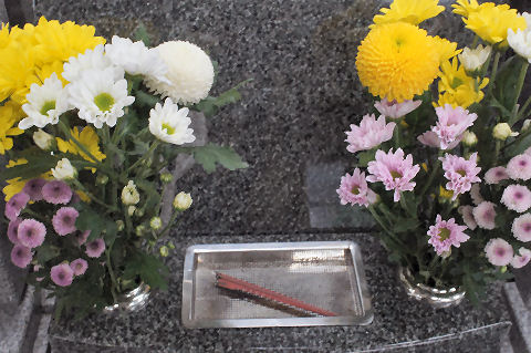 墓参りに今年は年末のもう一回の墓参りかな、汚い湯飲みが勝手に置いてあったので撤去。年末に近づいて花が高くなった感じ。 |