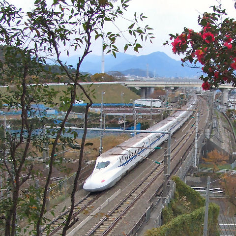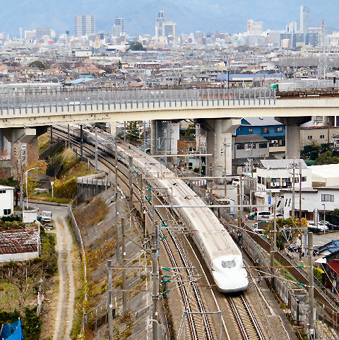 持船城址から新幹線城址へ上る農道がこの丘をトンネルで抜ける新幹線をちょうど見下ろせる場所があり有名な?撮影スポットのよう。 連続撮影モードで撮影、8枚くらいまではバッファがあるので快適。寒いし強風なので3−4本ちょっとだけ撮影して駅へ戻った。 |