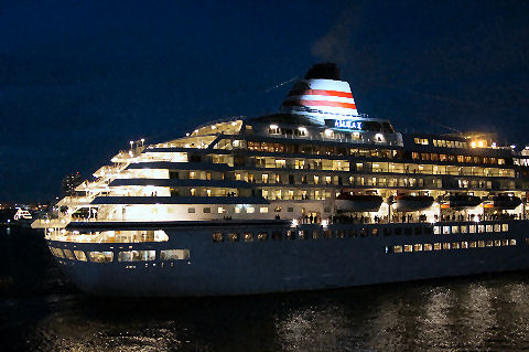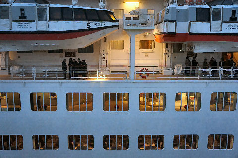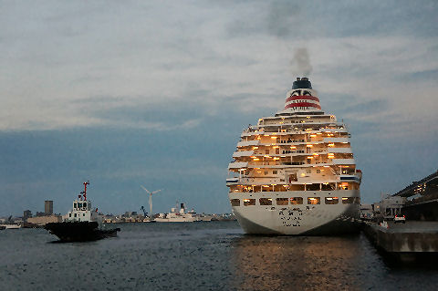 一泊クルーズだそうでクリスマスクルーズで1泊で名古屋まで行くショート!クルーズだそう、ほぼ満員の様子。午後5時出航でスラストを動作させてゆっくりと岸壁を離れ ベイブリッジ方向へ進んでいった。三脚を持ってないので遠景はぶれて撮影できず。 |