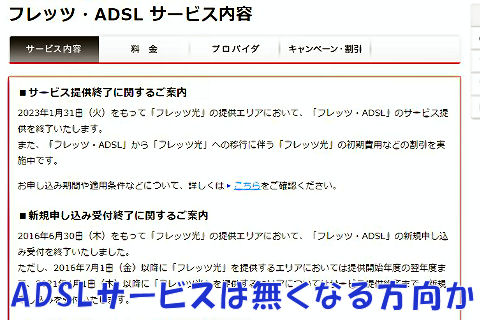 ADSLサービスは廃止方向?ドコモは2023年にADSLサービスの終了を宣言、利用者減で設備更新の難しさが重なっているのが主因のようだが。 マンションのような建築物では現在は個別に光ファイバを引くのは難しいが、最近NTTが各戸までのファイバの通線可否の調査をしていたので状況が変わるかも、と期待。 |