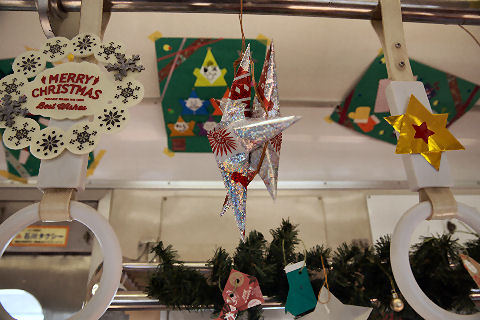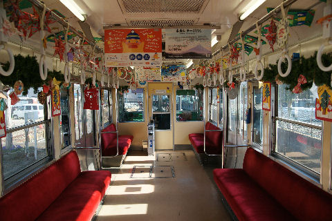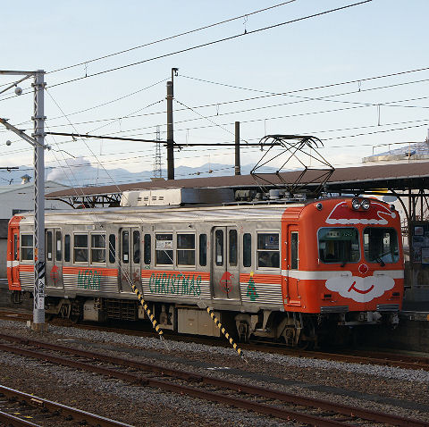 電車と富士、クリスマス電車もちょうど吉原駅のはずれにある岳南電車のホームの単車のサンタ電車が止まっていた。 |