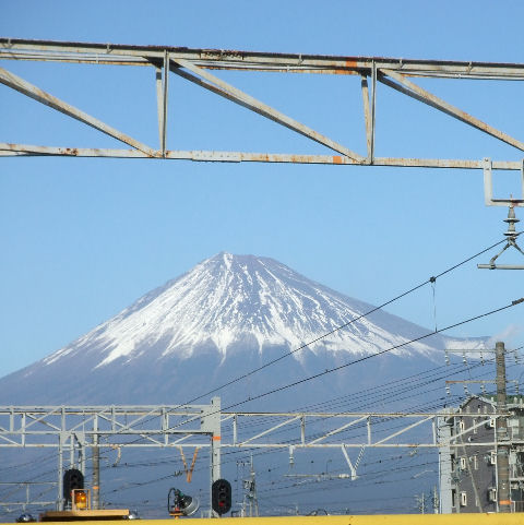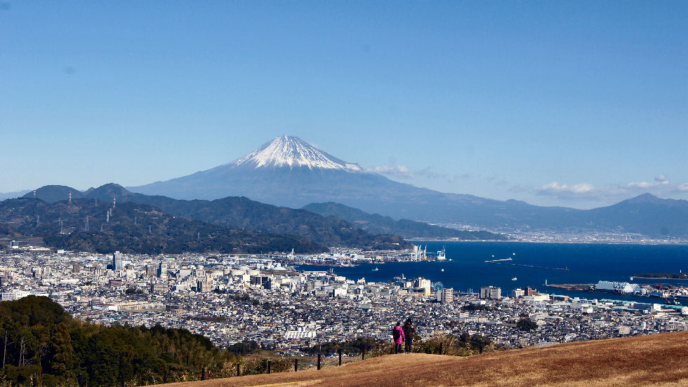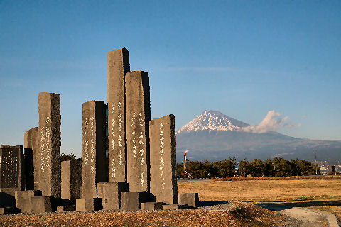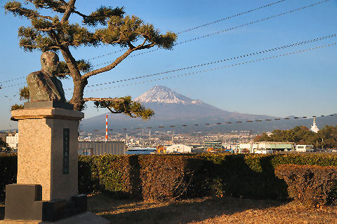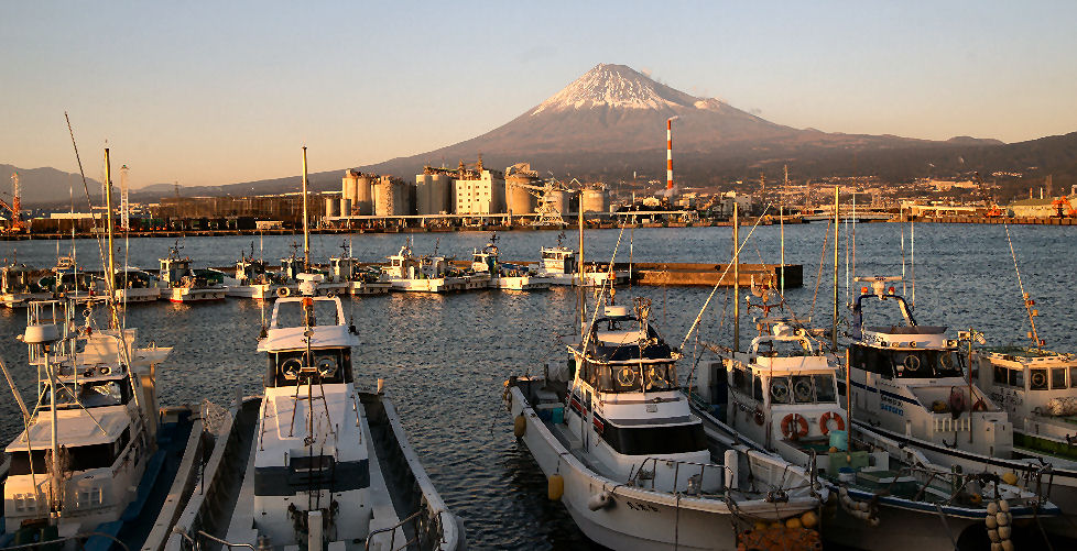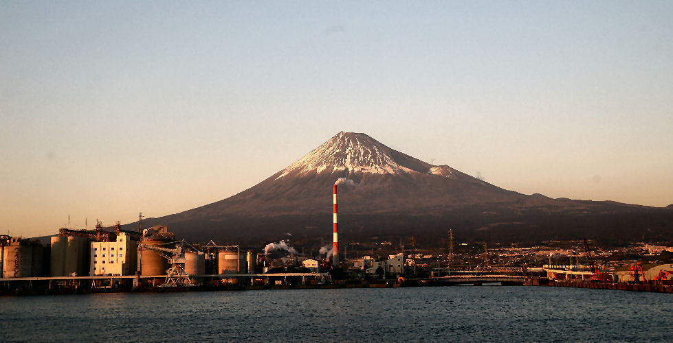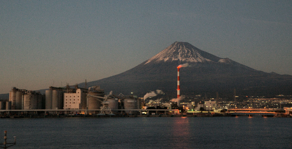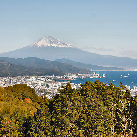 富士山の見える町清水(旧・江尻)や富士川町(旧・岩淵)からは富士山がよく見える、吉原や田子の浦からも見えるが工場や住宅があるため電線や煙突が目障り。 |