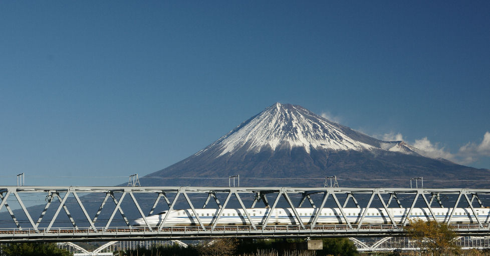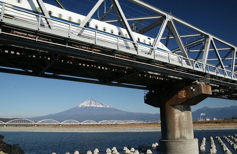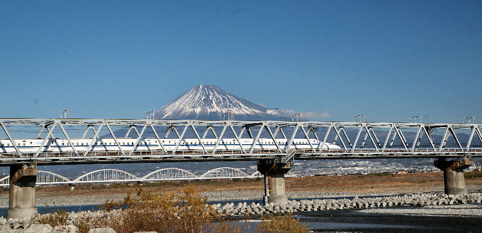 旧東海道は山の向こう新幹線の富士川鉄橋は在来線からかなり下流にあり、駅から徒歩で10分程で堤防に着く。 有名な?新幹線鉄橋をくぐって富士山が見える構図は河原に降りて撮影すると川面が入って綺麗な構図のなるがロープで立入禁止の表示がある。 |