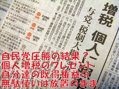 選挙で大勝した自民党から国民へのプレゼント敵失で大勝した自民党・安倍政権、さっそくやるのが国民の財布からお金を巻き上げること。 人気取りの目玉政策に必要な原資を国民から広く掠め取ろうという趣旨、自分たちの既得権益につながる無駄使いはそのままで。 生活保護費が非保護レベルより高い、という理屈で切り下げようとする浅ましさ。 |