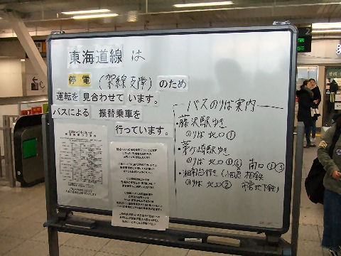 東海道線が長時間ストップ午後1時半ころ辻堂駅を通ると運休の貼り紙、11時台の列車が大幅遅れとなっているので午前中から止まっているよう。 墓参りの帰り道にもまだ運転再開とはなっていなかった、どうやら京浜東北線の鶴見側鉄橋あたりで架線が切れて停電となったよう。 |
