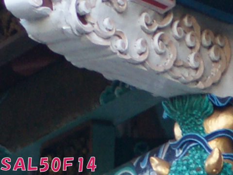 こちらはSONY現行SAL50F14の100%サイズ切出し設計は旧ミノルタから大きくは変わってないようだがデジタル用にレンズのコーティング等が変更されているよう。 解像度は十分良い、下の画像はもう暗いので解像度はいまいちだけど。 |