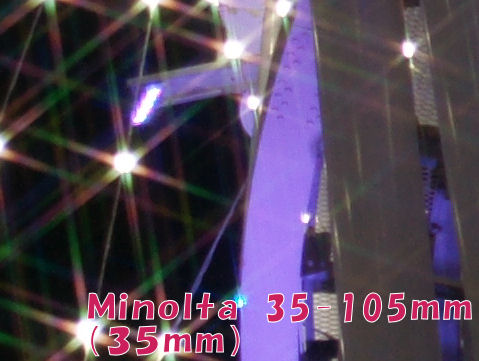 こちらはシグマ超広角と旧ミノルタレンズシグマは18-35mmという古い超広角レンズの中古格安品、フィルム時代のレンズなので内部反射などの対応が弱い(撮像素子の表面反射など考慮していない)が明るすぎる画像でなけらばまあまあか。 35-105mmは旧ミノルタのフィルム用普及レベルレンズ、まあまあ使えるがそれなり。 |