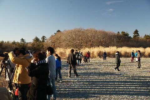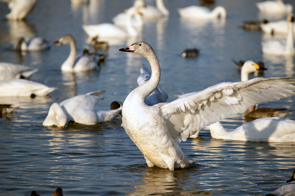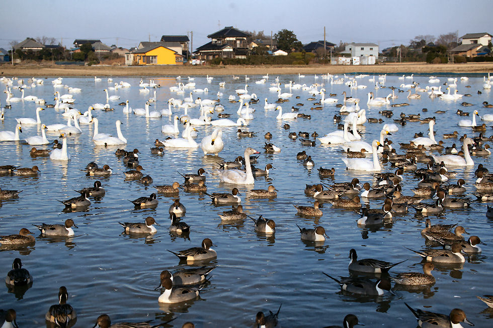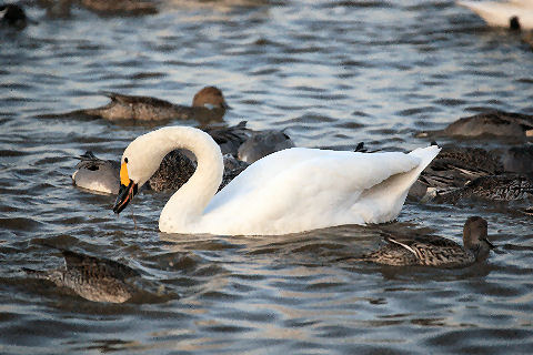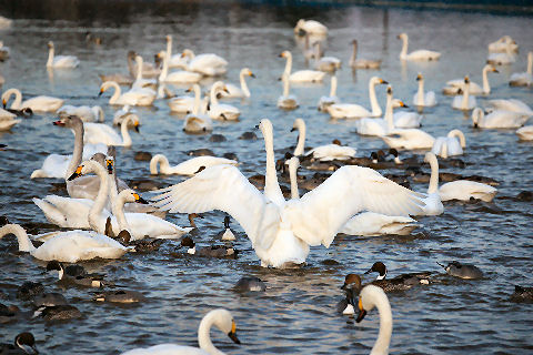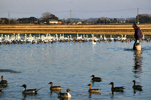 田んぼに水を張り餌を与える白鳥は怖がりらしく餌を蒔いても最初に寄って来るのは鴨たち、その後恐る恐る白鳥が近づいてくる。田んぼに水を張った仮設の池なので浅い、白鳥が足を伸ばすと立ち上がれる程度。 現在550羽程度が来ているよう、ピークでは1000羽以上がやってくるとのこと。餌は何かと聞いたら昨年獲れたお米だとのこと、新米が獲れたのでもう食べないので白鳥の餌だそう。 |