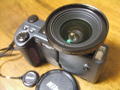 NIKONのワイコンWC-E63を買ってみた宅配便送料込みで729円と何故か格安で落札、今日届いたので早速CoolPix990に付けてテストしてみた。 このアダプタは元々CoolPix900シリーズ用で28oのねじ込み式。 |