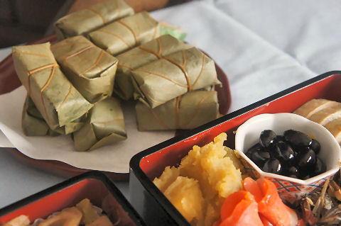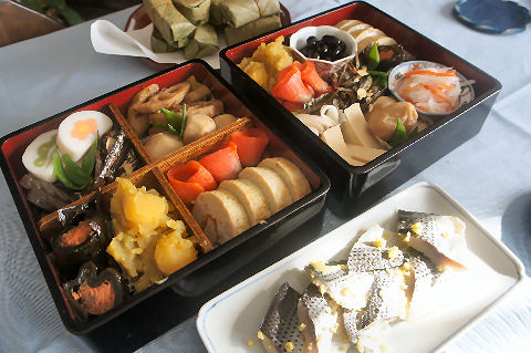 昨日届いた柿の葉寿司の3種を賞味(さば、さけ、金目鯛)、他は定番もの。 |