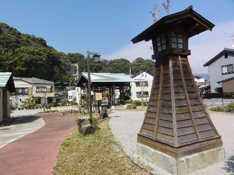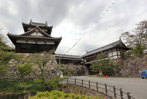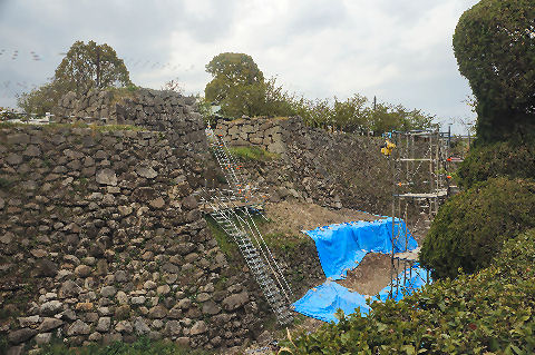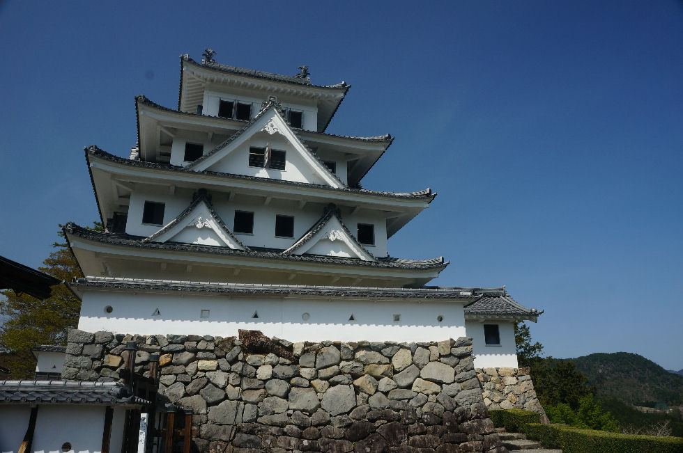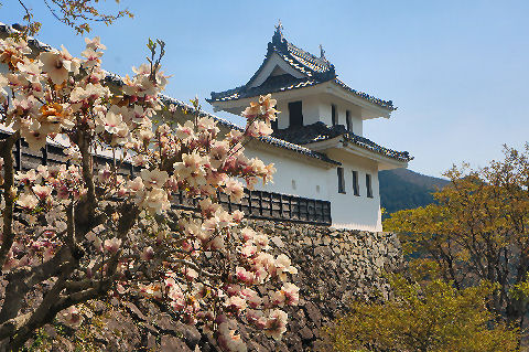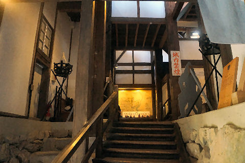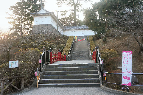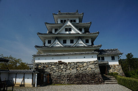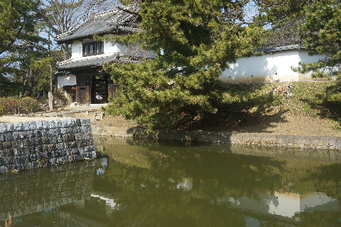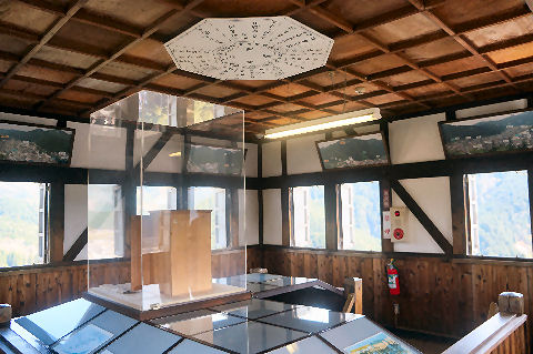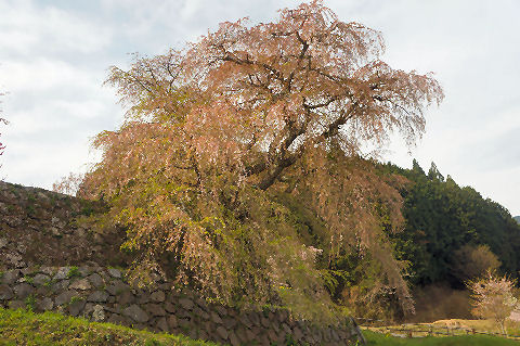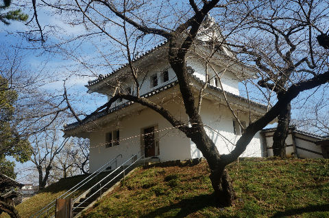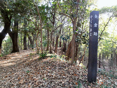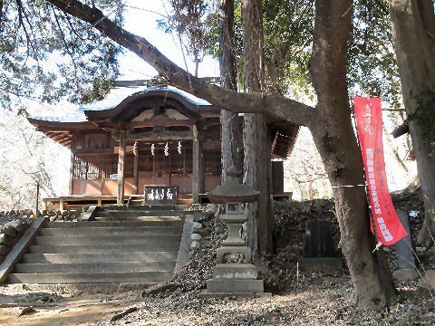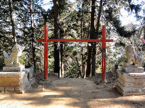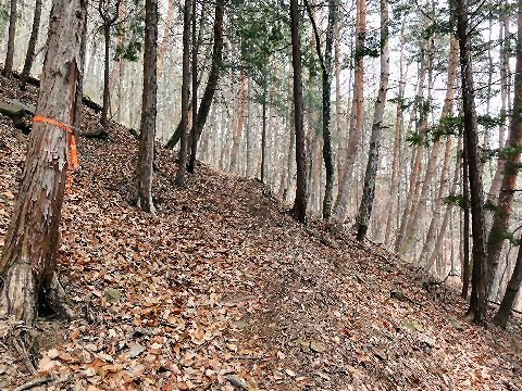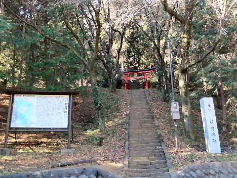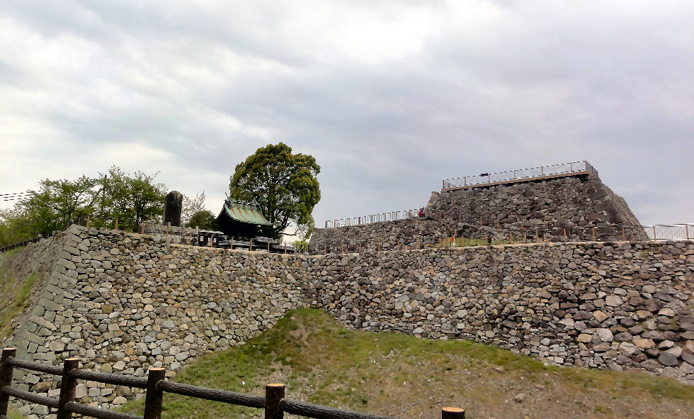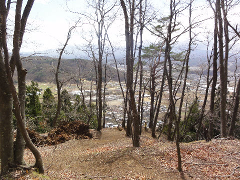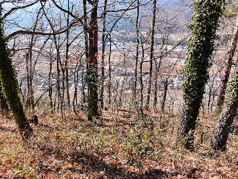 背面は断崖絶壁で強固現在は神社が山頂にあり階段が設けられている、全面にあった水堀も埋められ畑などに変わっている。 |
