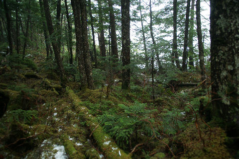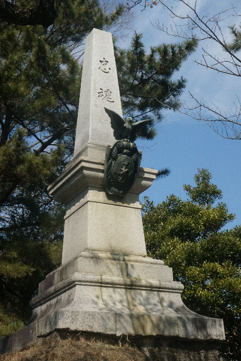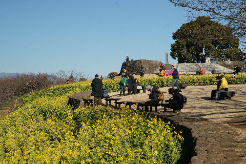 四角いが内部は窪んだ平地周囲は石垣で囲んであるが中心部は窪んだ平地で弾薬庫などがあったよう、外から見えないように低くしている? 石垣近くへが降りられないように柵があり、有名な?石柱もまともには見られない(撮影するには石垣から落ちそうになるはず)。 |