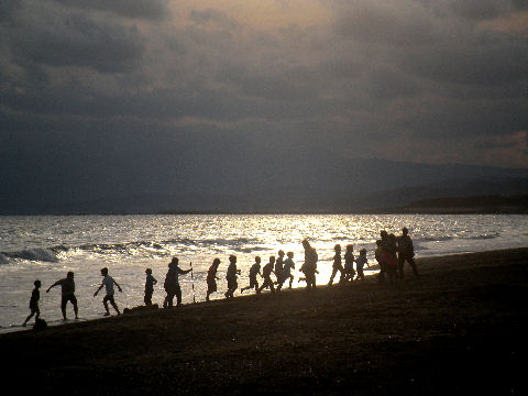 幼稚園のイベント?なぜか網を曳き始めるとカラスや鳶が集まってくる、棄てられる魚やサメを狙っているよう。 |